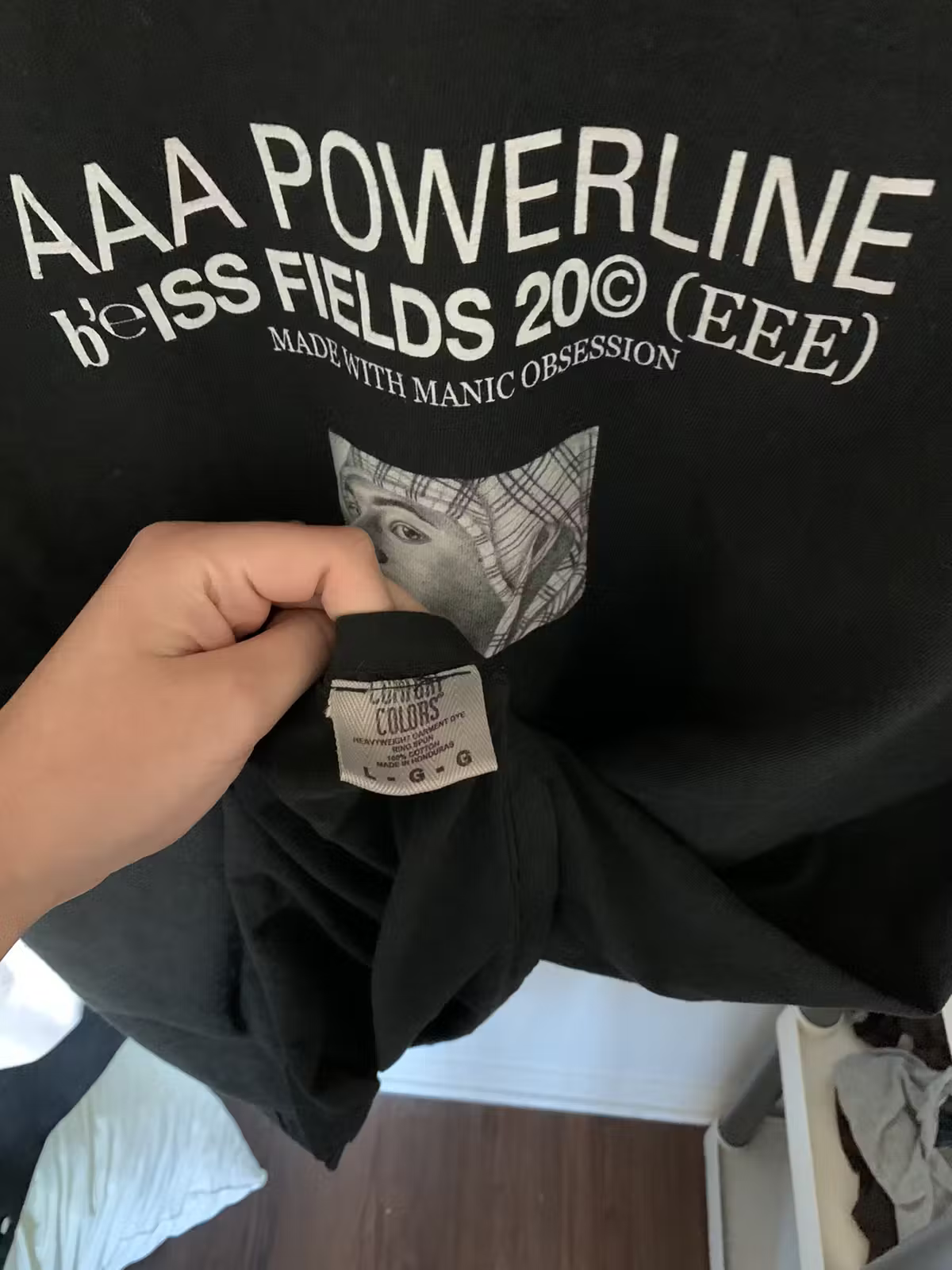 Sold on Yves Tumor's Heaven To A Tortured Mind Tour in 2020 on shows that featured Ecco2k. Has a different fit, tag, print and packaging compared to EU version. Restocked on April 7, 2020 on e-ec.co website.