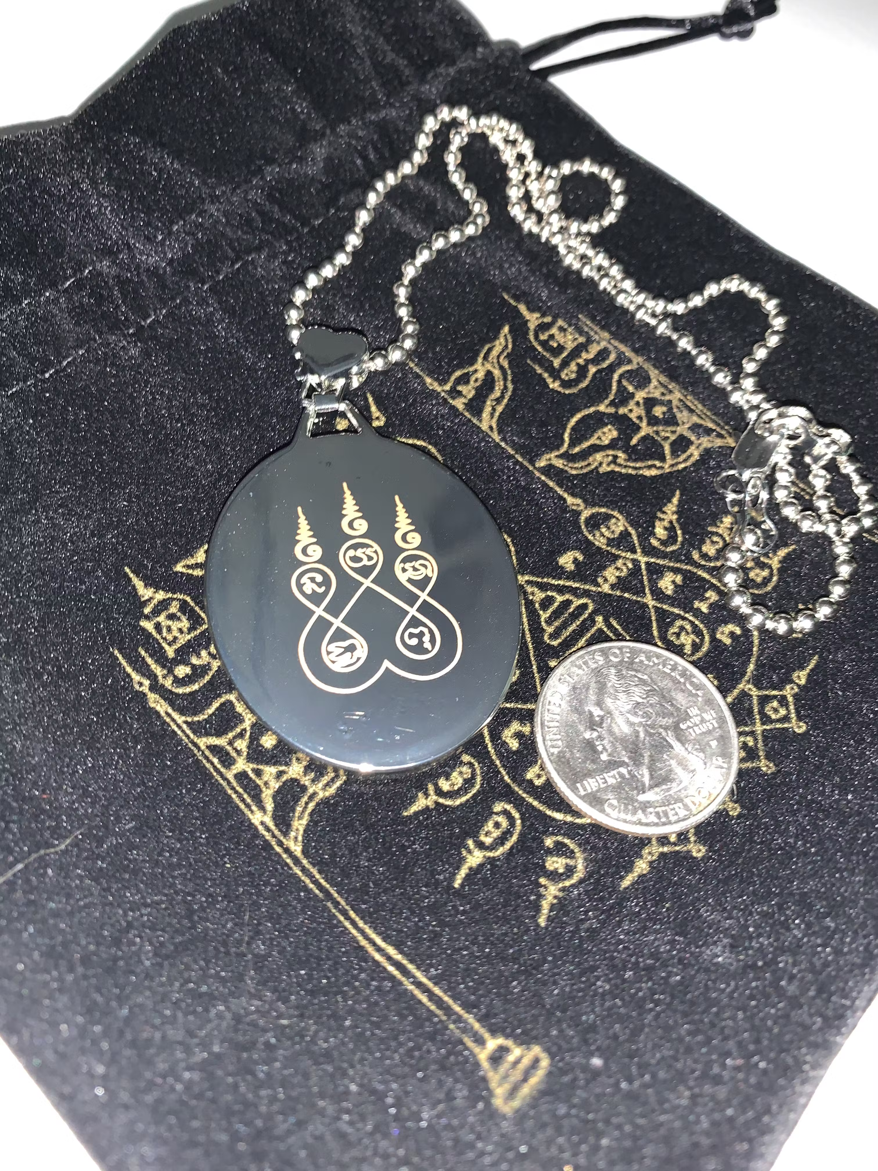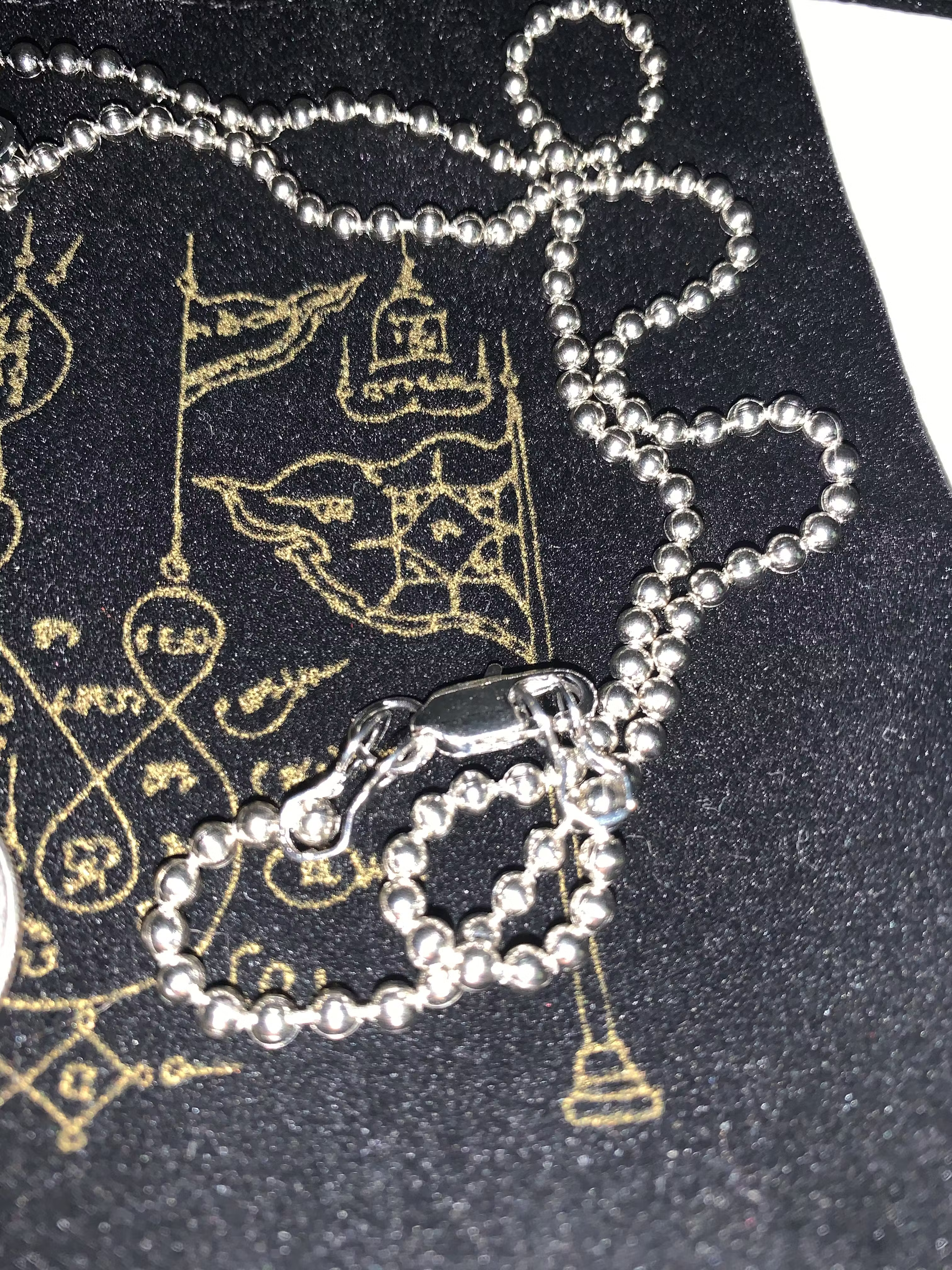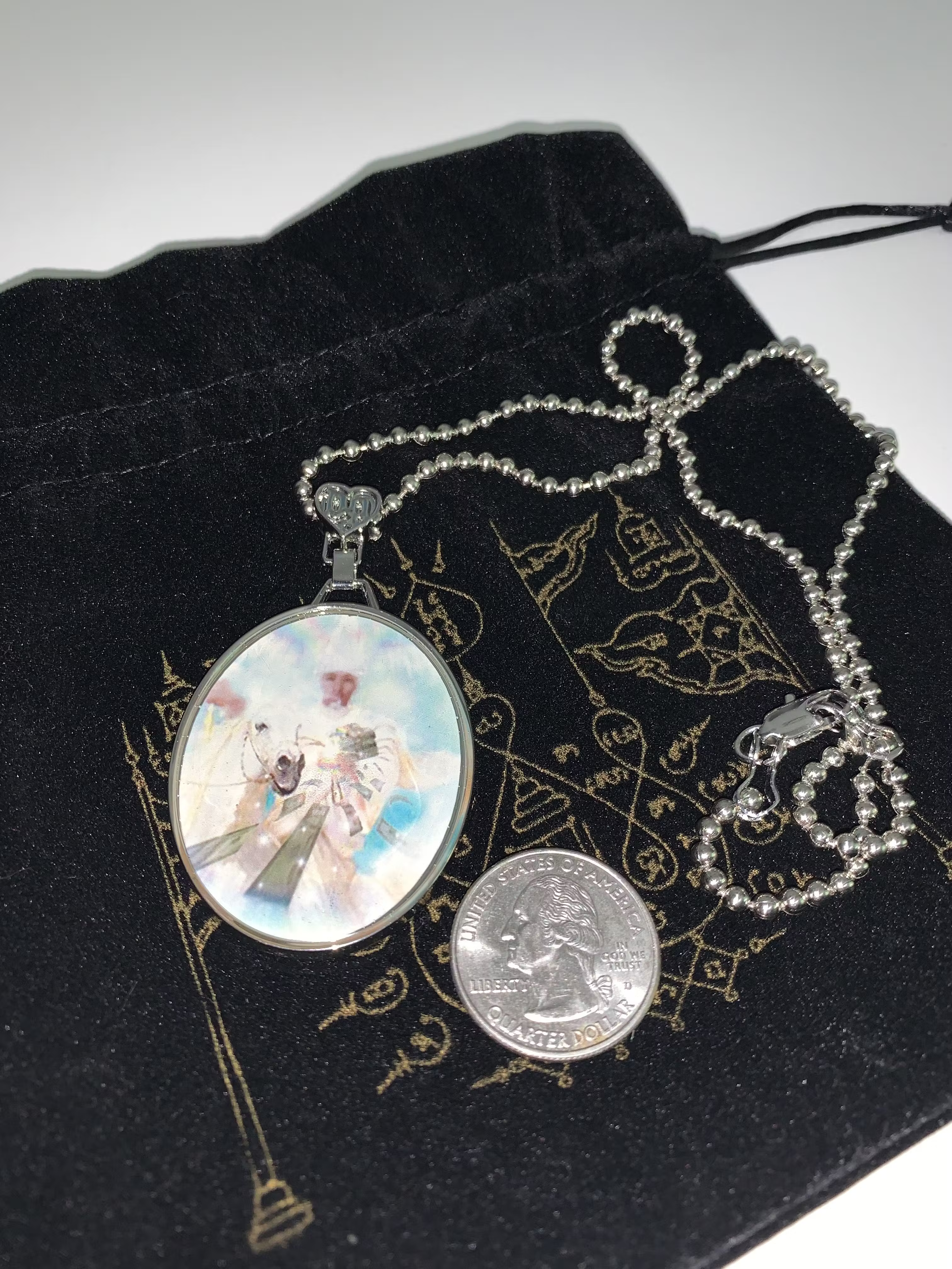 Came in a black dust bag. Zinc-alloy pendant with clear resin coating and laser engraved backside. Brass ballchain, lobster claw clasp. 500mm.