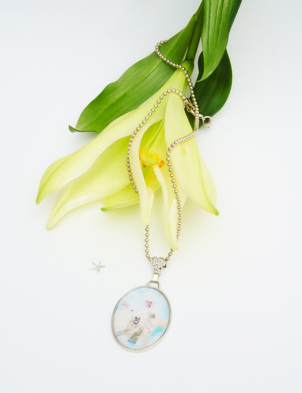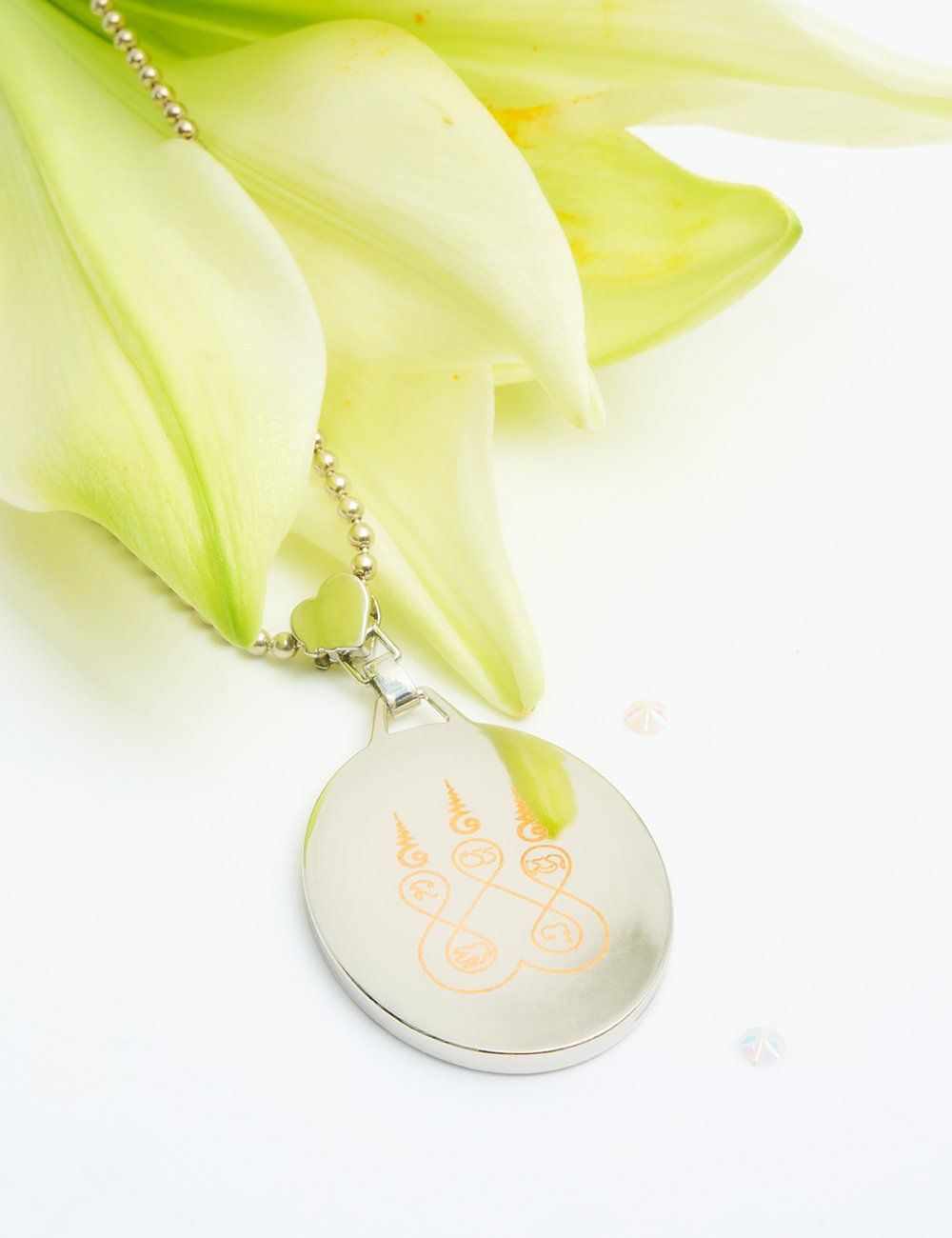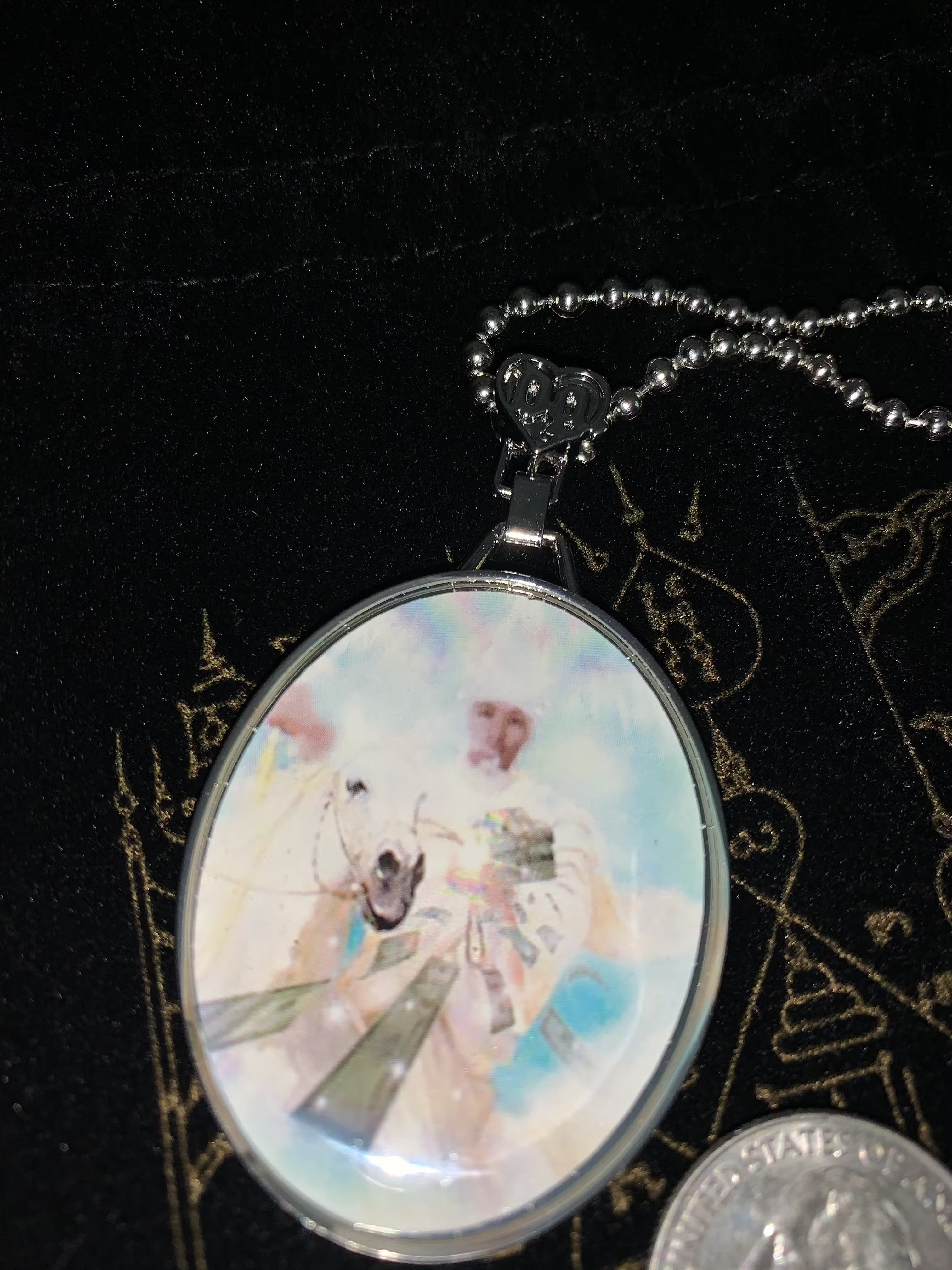 Came in a black dust bag. Zinc-alloy pendant with clear resin coating and laser engraved backside. Brass ballchain, lobster claw clasp. 500mm.
