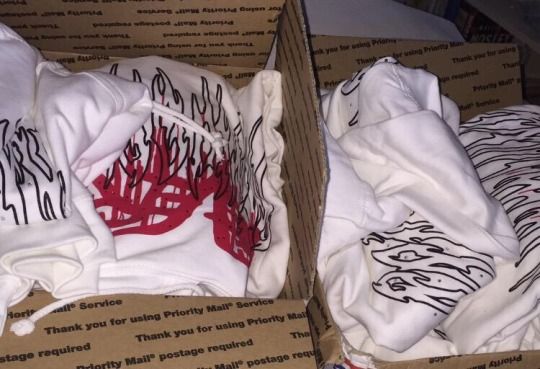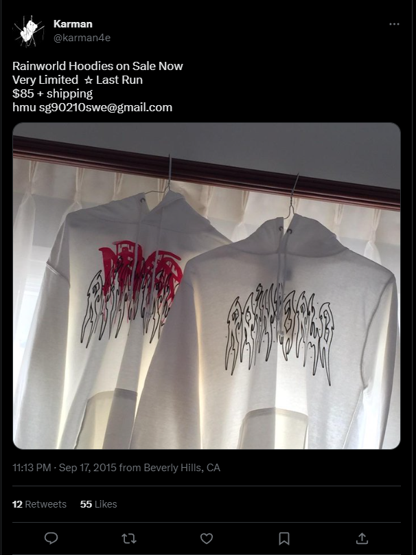Sold by Karman on his Twitter. Logo on the chest is a lot larger compared to other Rainworld hoodies. Has a characteristic print on the hood and a red NeVeR print layered over the standard logo. Contains red rhinestones. Fakes in circulation - be careful when buying second-hand.